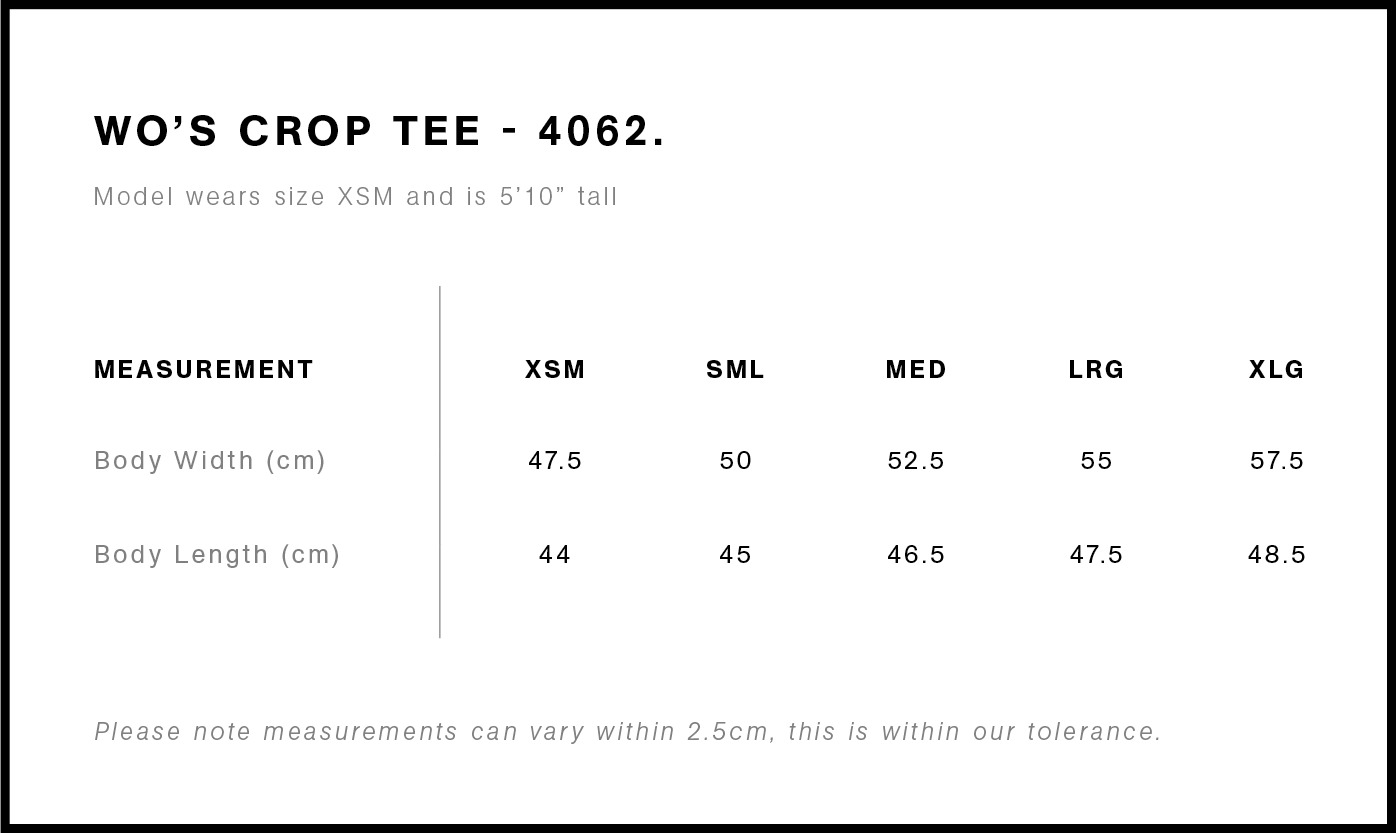 Short body, dropped shoulders, neck ribbing, side seamed, shoulder to shoulder tape, double needle hems, preshrunk to minimise shrinkage